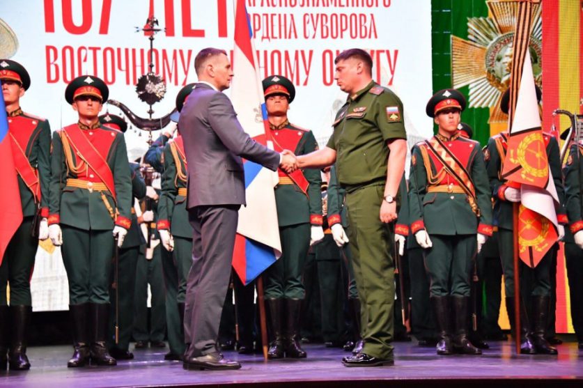 1 августа, АВРОРА⭕МЕДИА. Губернатор Хабаровского края Дмитрий Демешин принял участие в торжественном собрании, посвященном 107-й годовщине со дня образования ордена Ленина Краснознаменного ордена Суворова Восточного военного округа.