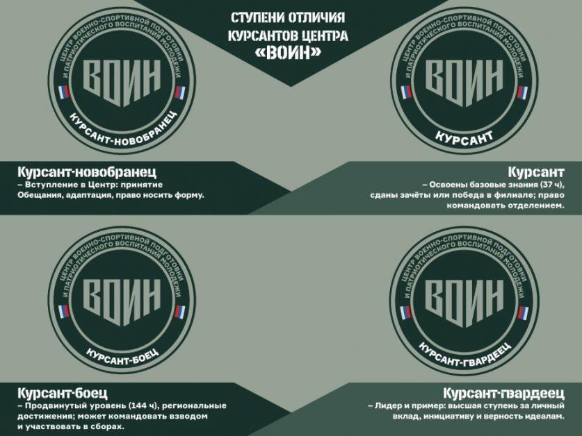 12 ноября, АВРОРА⭕МЕДИА. По поручению заместителя председателя правительства РФ, полпреда президента в ДФО Юрия Трутнева, в Центре «ВОИН» введена система из четырёх ступеней отличия: «Курсант-новобранец», «Курсант», «Курсант-боец» и «Курсант-гвардеец». Новая модель позволит поощрять достижения воспитанников и формировать здоровый дух соревнования и ответственности.