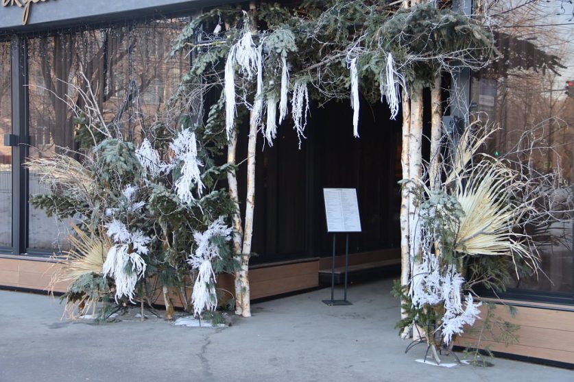 Один ресторан в центре ежегодно удивляет необычными декорациями. В этом году гостей ждут тематические композиции с берёзовыми ветвями, подчёркивающие русскую кухню заведения.