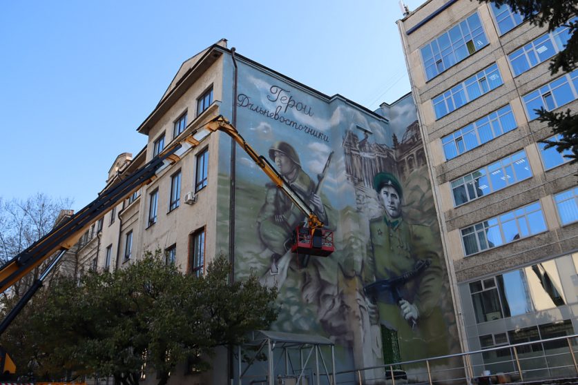 Композиция получила название «Герои-дальневосточники». Работы над ней идут уже две недели и завершатся к середине ноября. По словам автора, из-за сложной фактуры стены и погодных условий процесс требует высокой точности и специального оборудования.